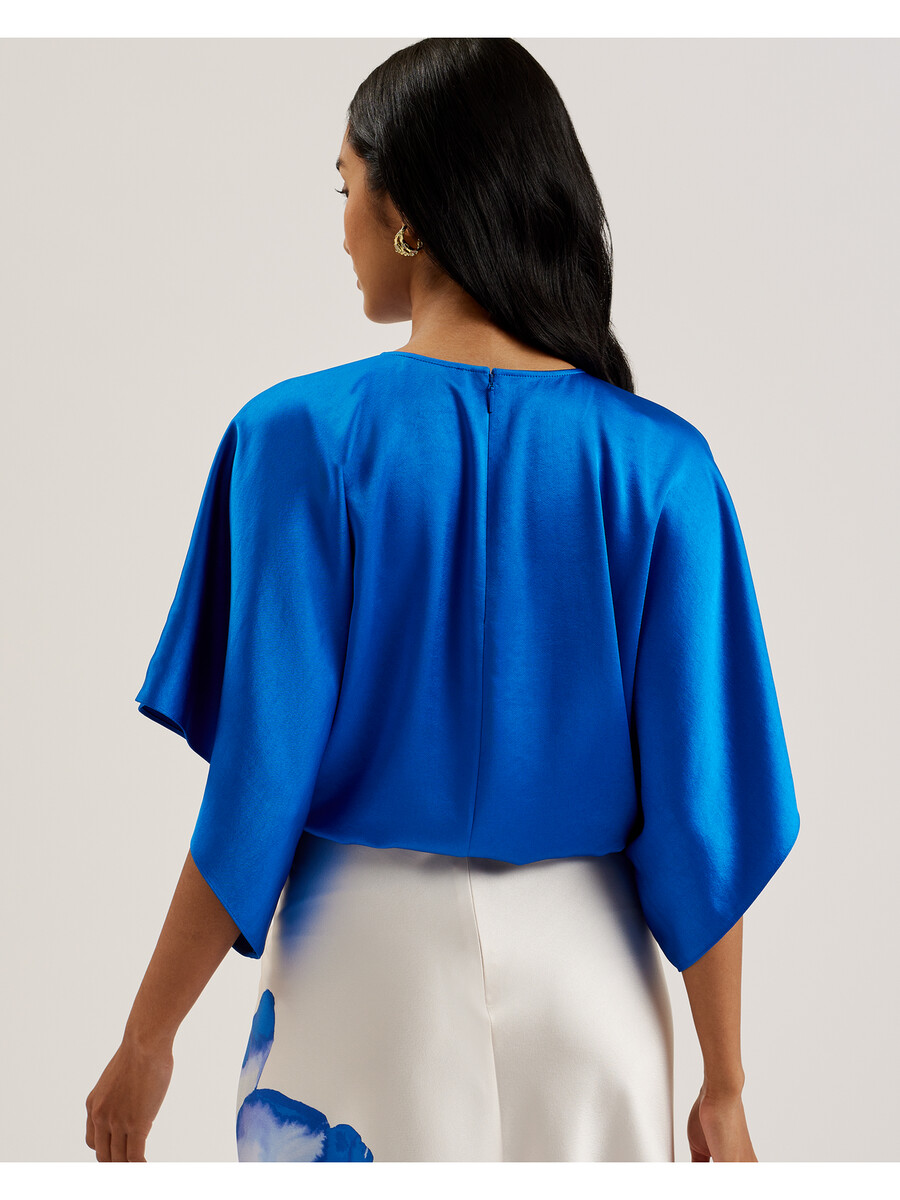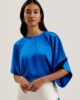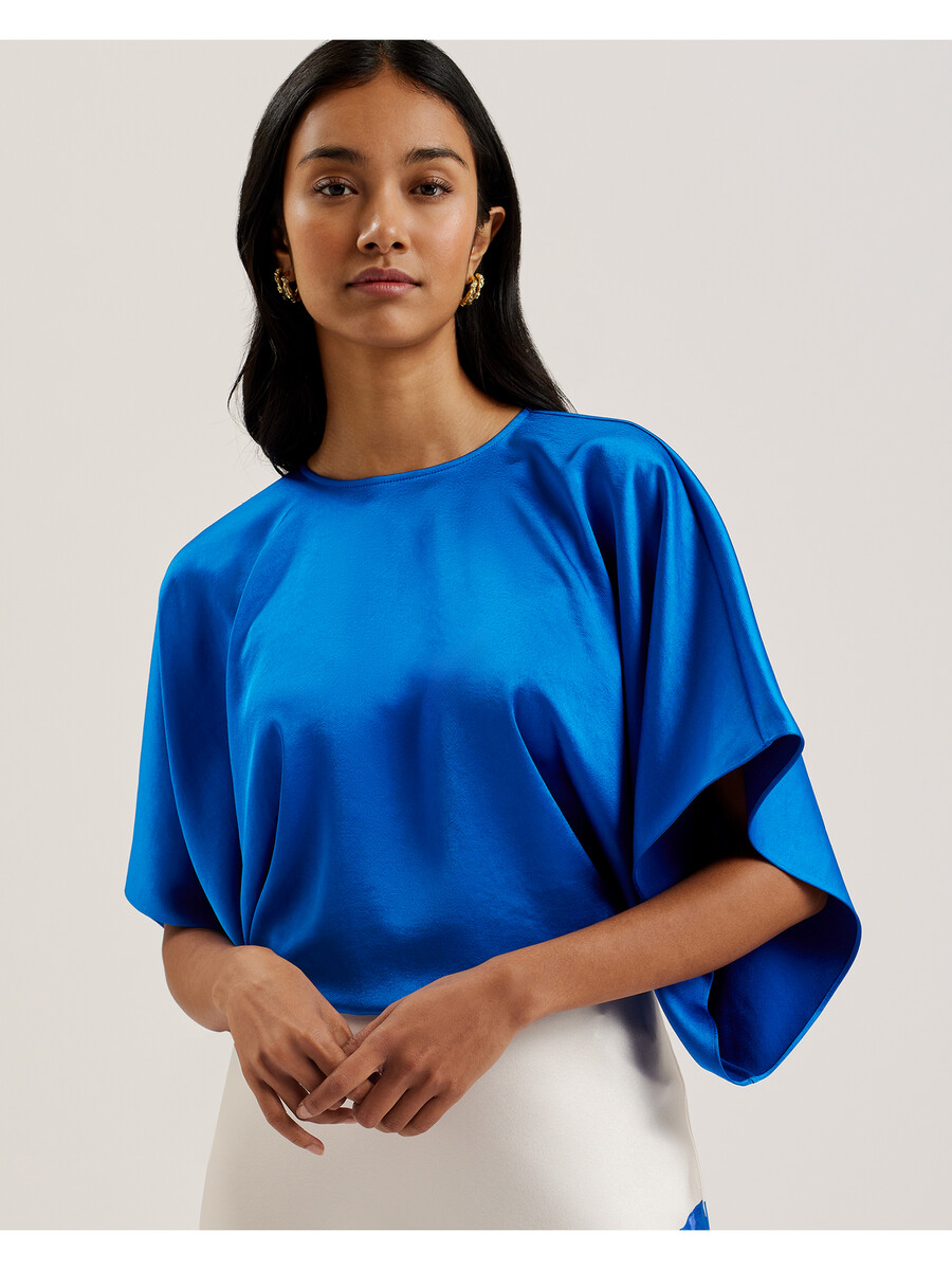 Enfärgad blus Breda fladdermusärmar Rund halsringning Satintyg Rak siluett Dold dragkedja maj är 1,74 m och bär blått i Ted storlek 1