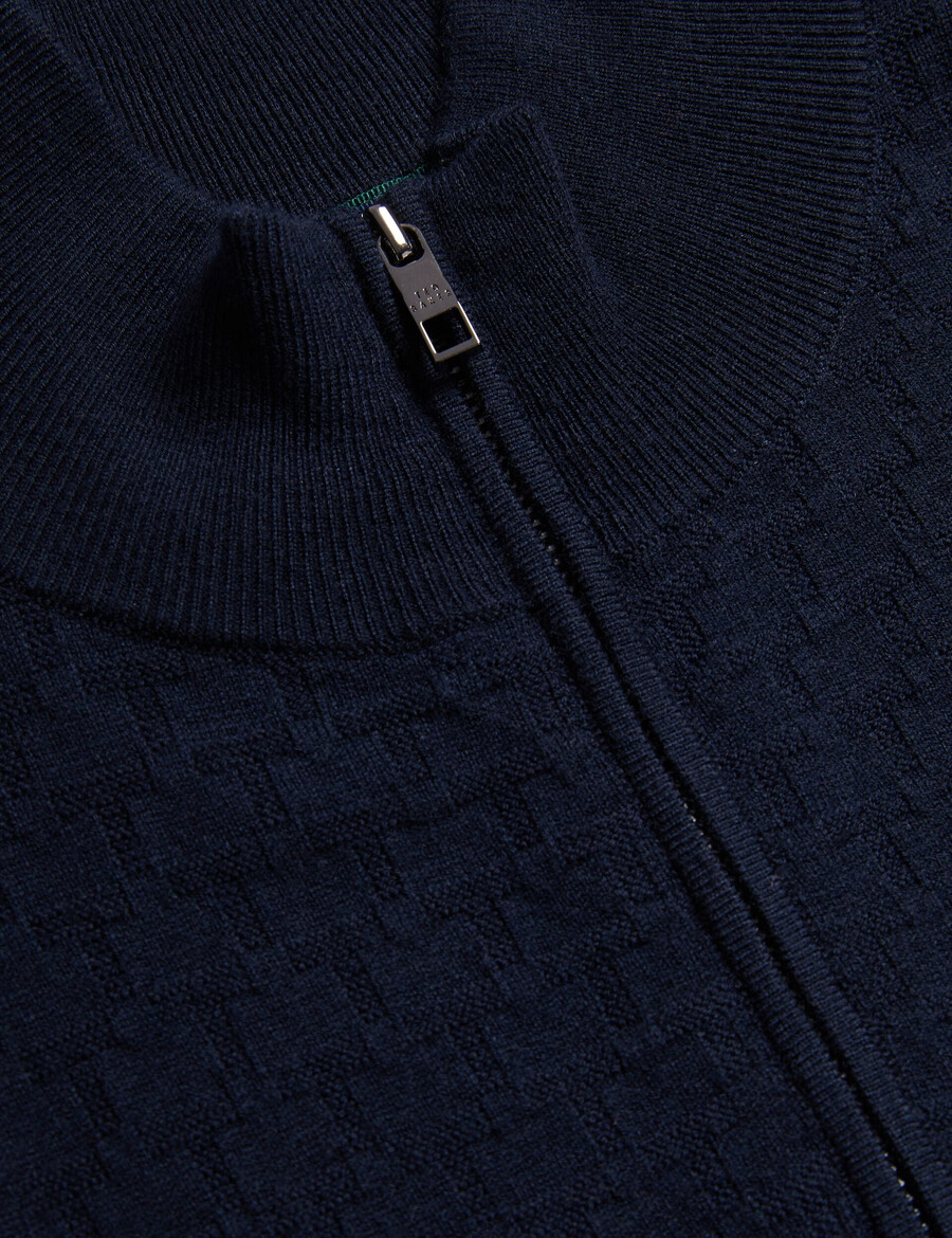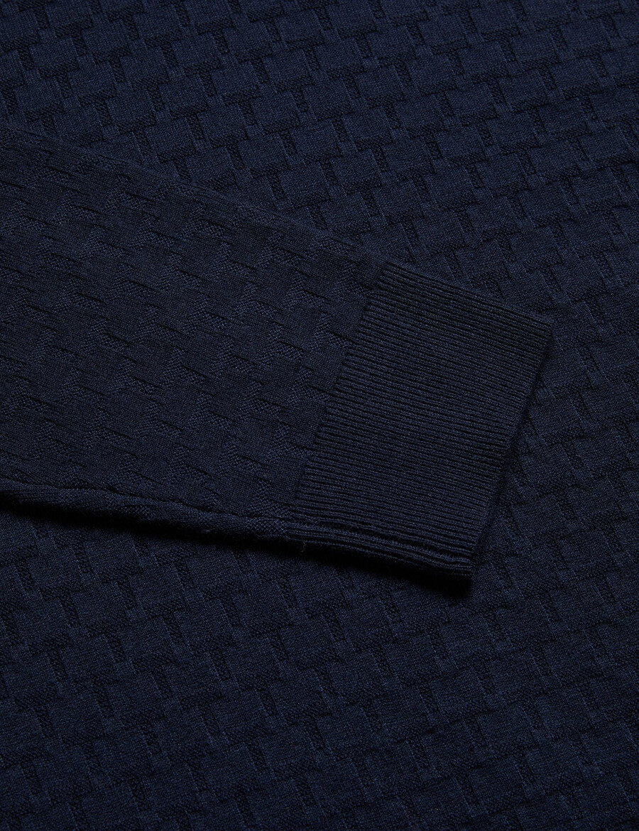 Långärmad tröja Ullblandning Texturerad T-stickad Halv dragkedja. Tratthals Ribbade kanter Lewis är 6’2″/1,88m och bär marinblå i Ted storlek 3 32% Polyester, 31% Polyamid, 28% Akryl, 7% Ull, 2% Elastan, kan tvättas och tvättas.
