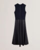 Hånbar midiklänning Ärmlös stickad överdel Topp i konstläder A-linjekjol Asymmetrisk fåll med delad paneldetalj Exponerad dragkedja i maj är 1,74 m och bär en Ted storlek 1. Övre: 80 % viskos, 20 % polyamid; nedre ytterkant: skal: nedre skal: 100 % polyamid; 100% PolHandtvätt 1 prick strykjärn P kemtvätt