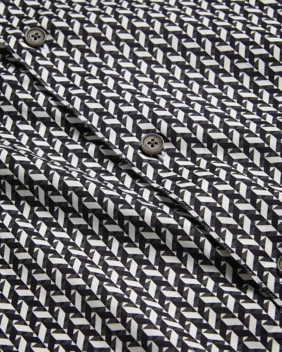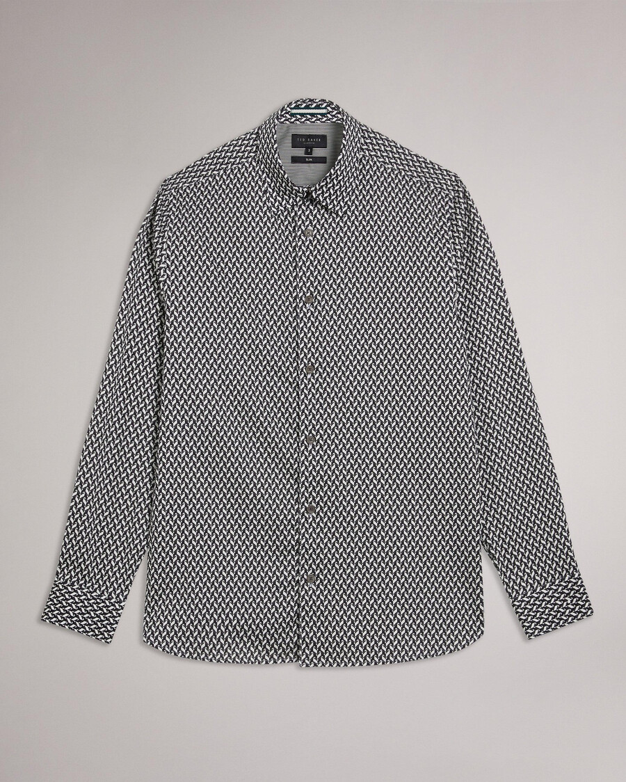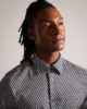 Långärmad skjorta Chevron geometriskt tryck Slim fit bomullsblandning med stretch Ted Baker logotypknappar Ty är 1,86 m och bär svart i en Ted storlek 3