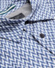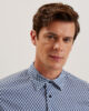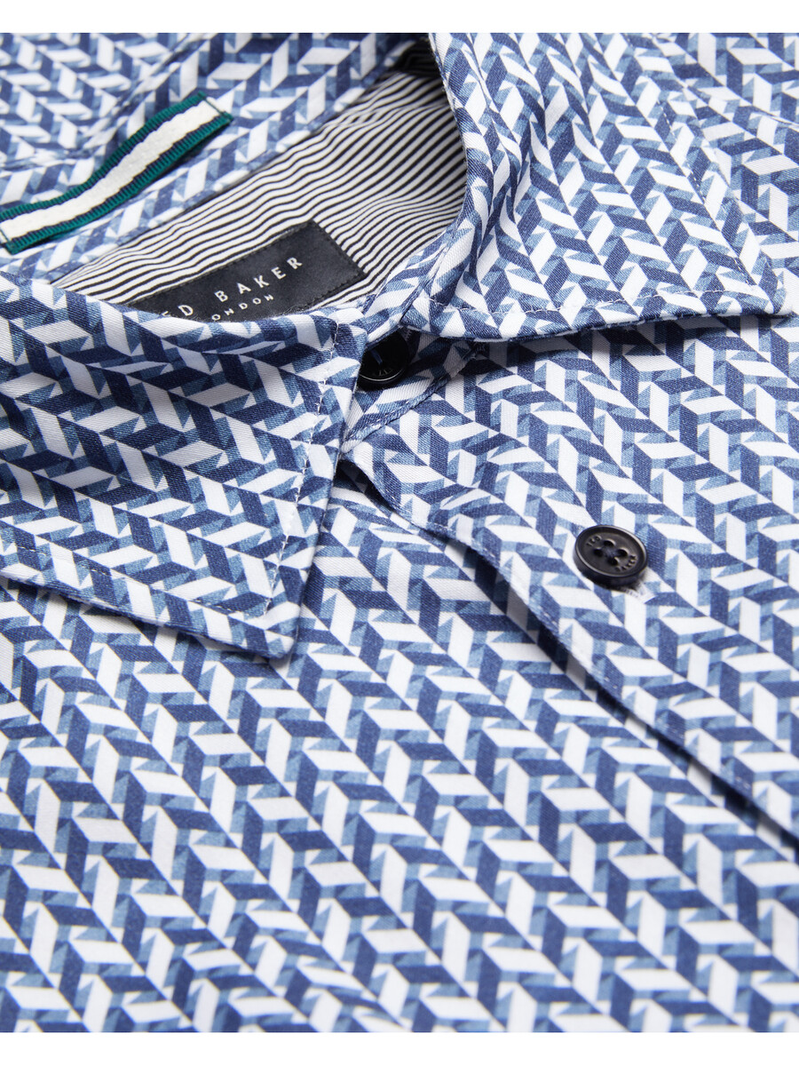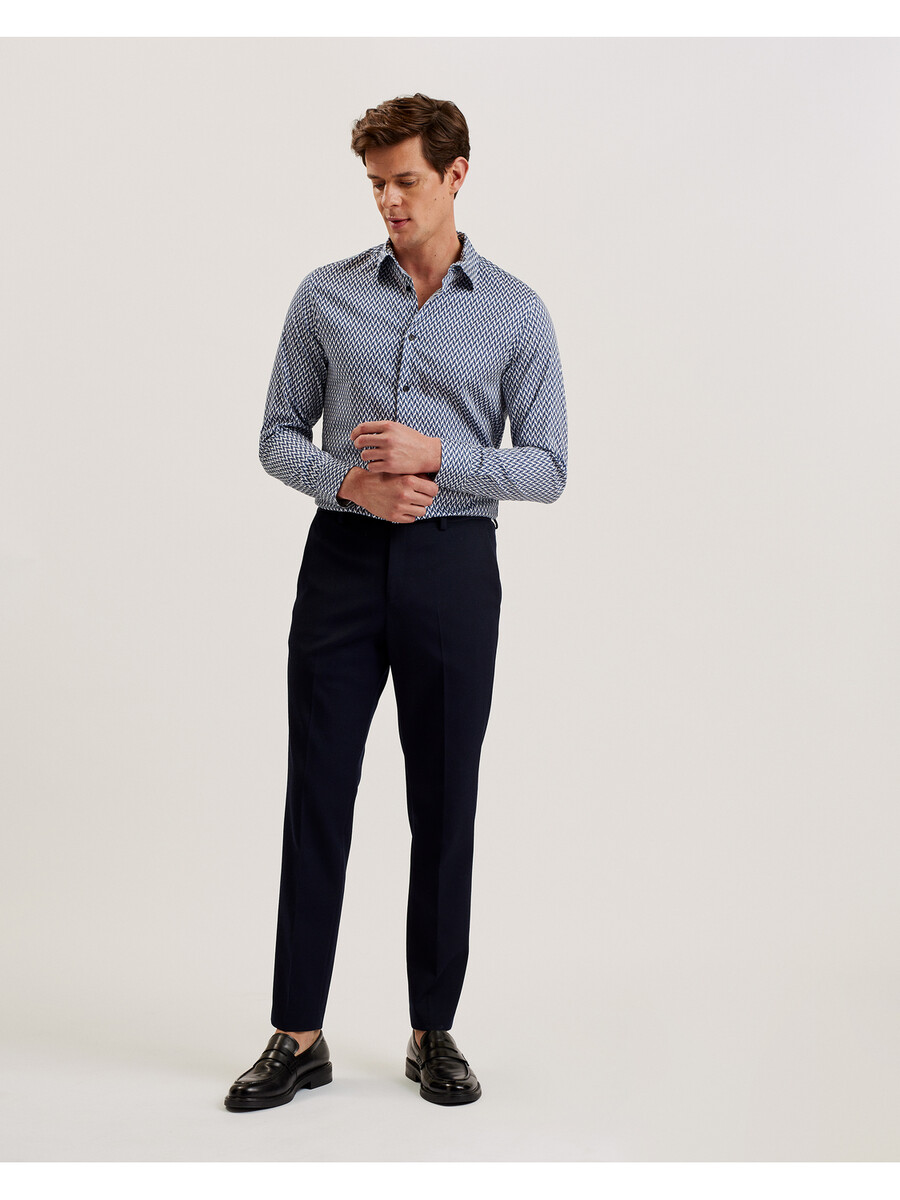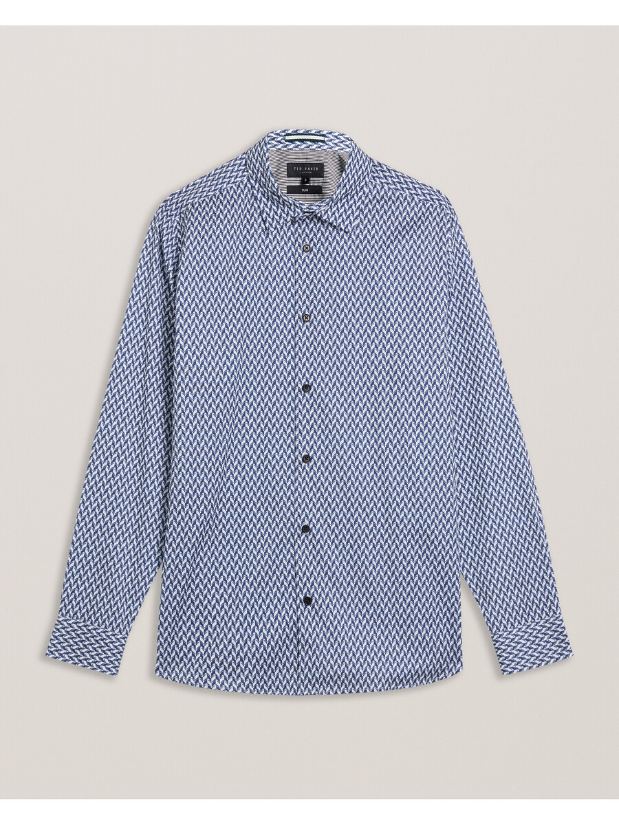 Långärmad skjorta Chevron geometriskt tryck Slim fit Bomullsblandning med stretch Klassisk krage Knäppning med T-trådsdetalj Lewis är 1,88 m och bär marinblå i Ted storlek 3