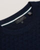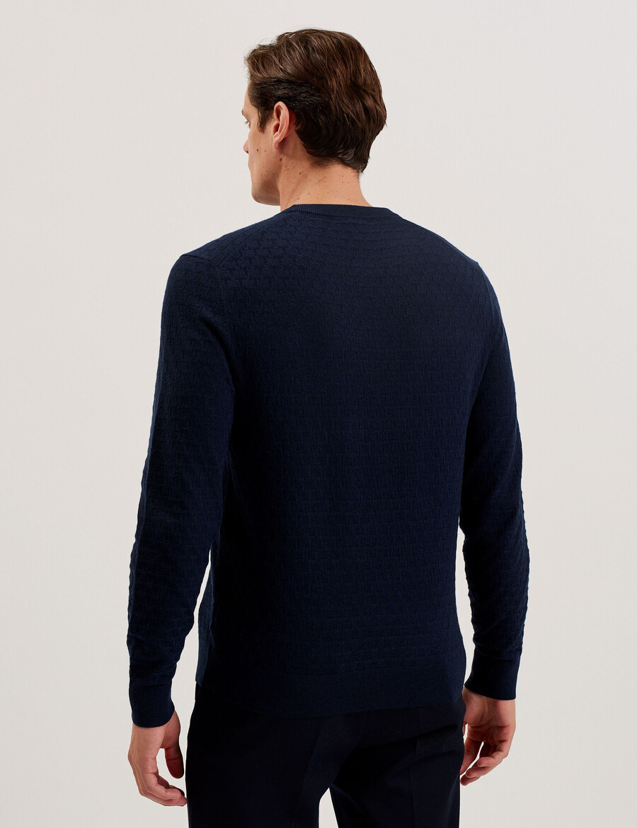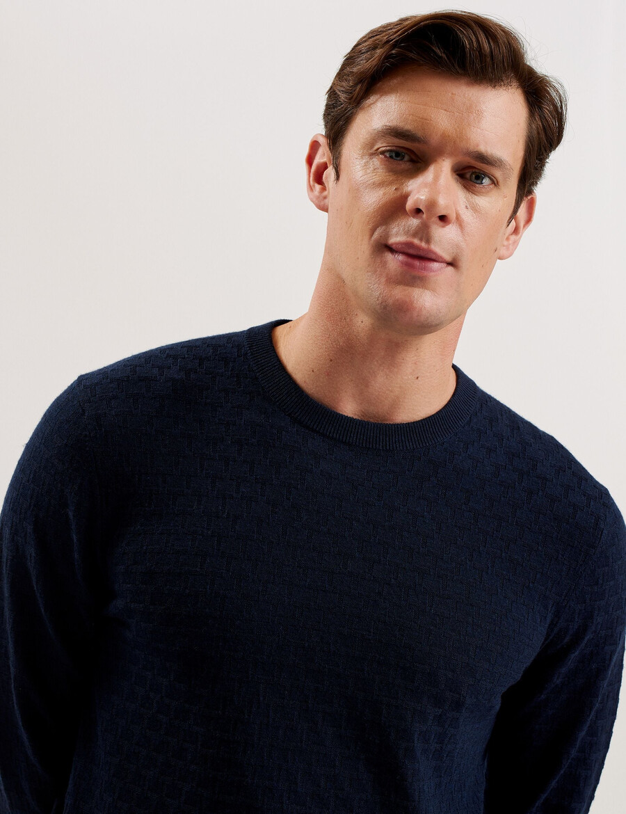 Långärmad tröja Stickad ullblandning Texturerat T-mönster Rund hals Ribbade kanter Lewis är 6’2″ / 1,88m och bär marinblå i Ted storlek 3 40% polyester, 30% akryl, 20% polymaide, 10% ull. Maskintvätt i 30°C, får ej kemtvättas