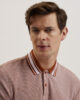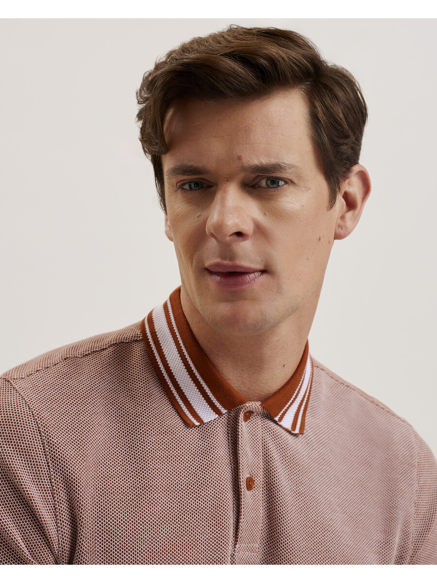 Kortärmad pikétröja Honeycomb textur 100% bomull Klassisk krage Halvknappslå Randiga stickade kantdetaljer Delad fåll detalj Lewis är 1,88m och bär brun i en Ted storlek 3 100% bomull